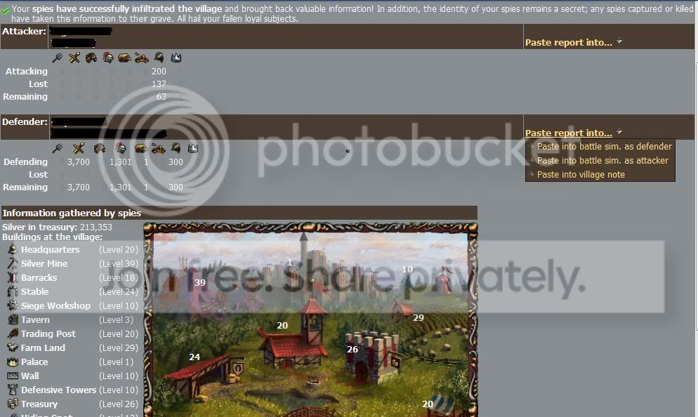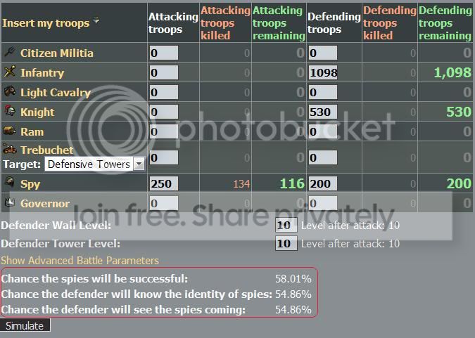 - The result of ONLY spy attack.The higher the ratio of the number of spies in the village to the number of spies attacking, the higher the chance that the defender will see the attack coming, the higher the chance he will find out who sent the spies, and the lower the chance the attacking spies will be successful in getting information about the target village. Attacking spies can only be killed by defending spies.
